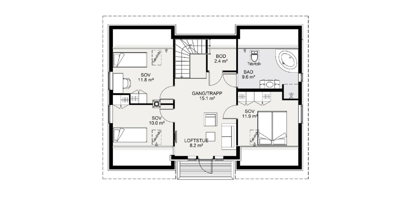 Velger du Mesterhus Kine med allromsløsning, får du god plass til en egen frokostkrok og et langbord for familie og venner. Du kan også legge til en peis, for de som drømmer om det.