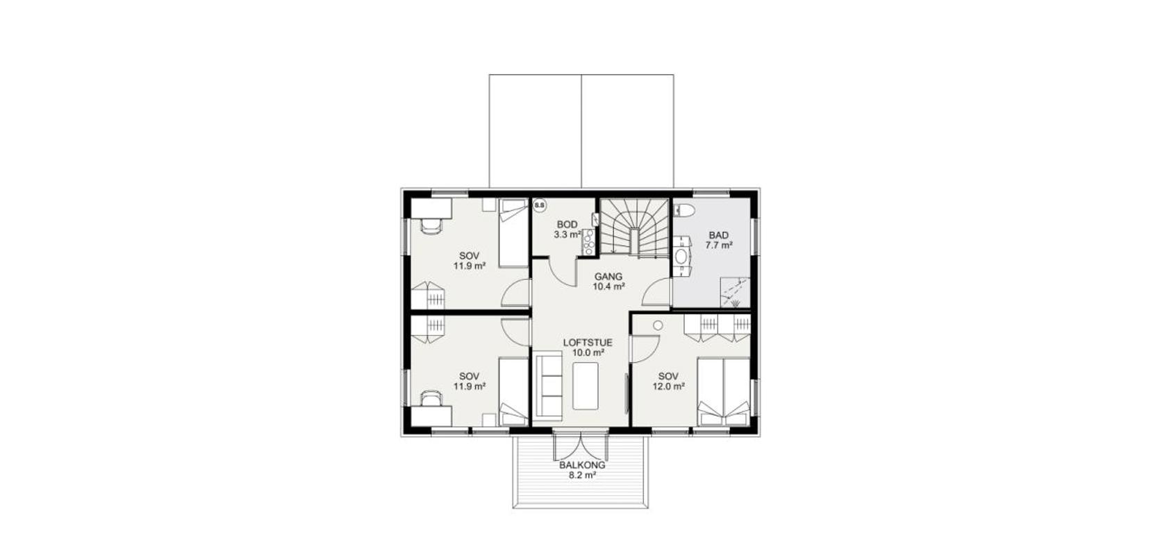 I andre etasje finner du tre romslige soverom, eget bad og en loftstue som kan brukes som en ekstra stue. Med en egen balkong tilknyttet loftstuen, kan du nyte den fantastiske utsikten over hagen og området rundt huset.