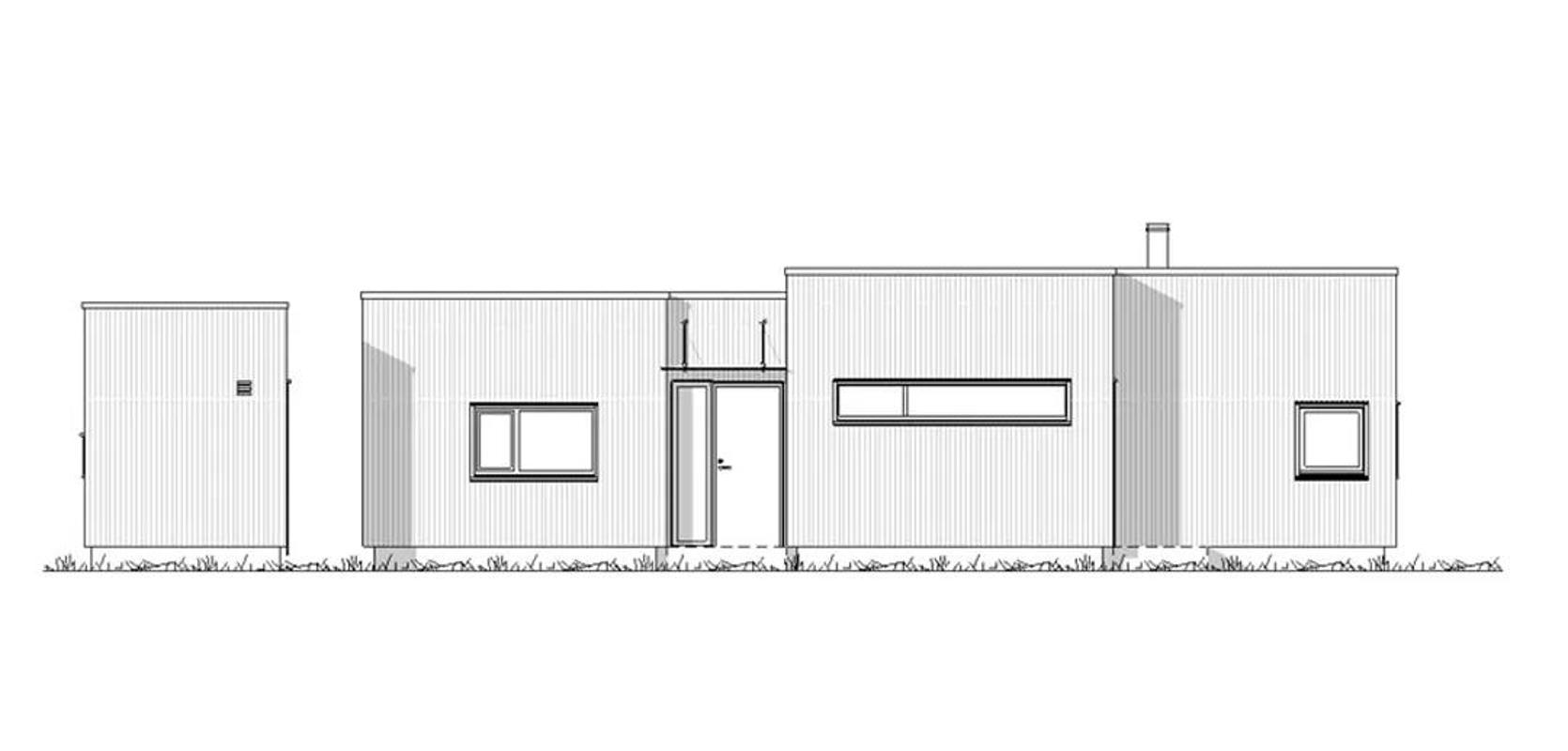 Funkishytte med store vinduer og pergola