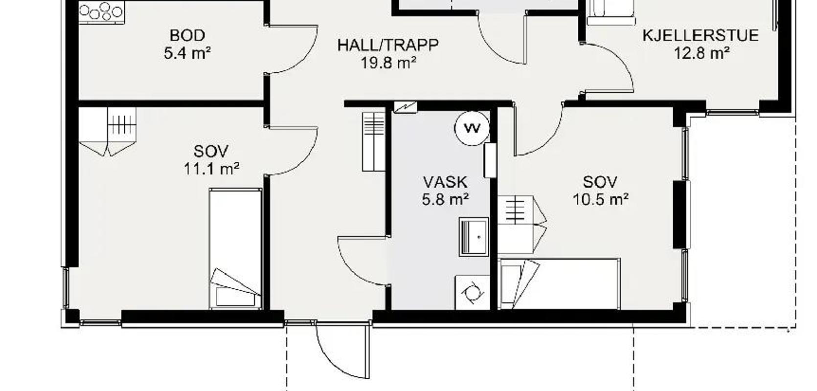 Første etasje er dedikert til hvile- og avslapningssonen, hvor du finner to soverom og en allsidig tv-stue som kan fungere som gjesterom eller et ekstra soverom ved behov. I tillegg til badet og romslig separat vaskerom, har denne etasjen også to boder, hvorav den ene har egen inngang fra utsiden. Svært praktisk planløsning.