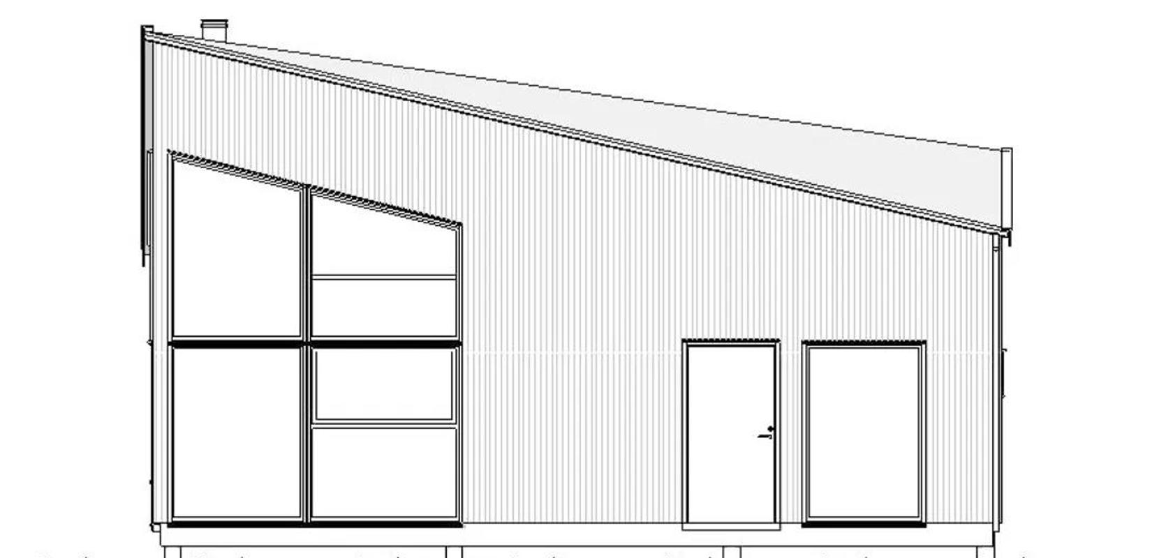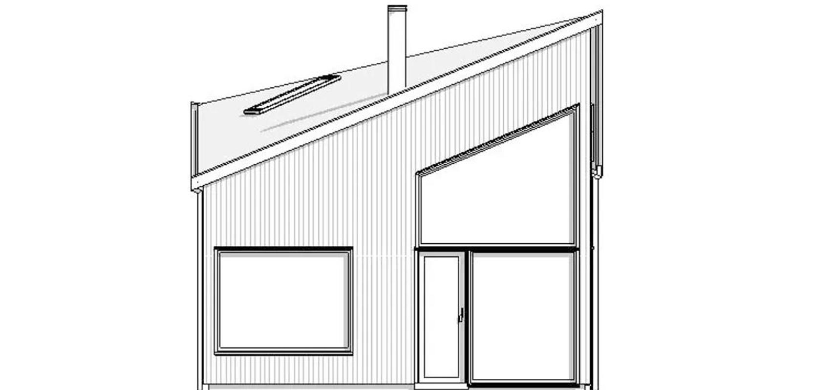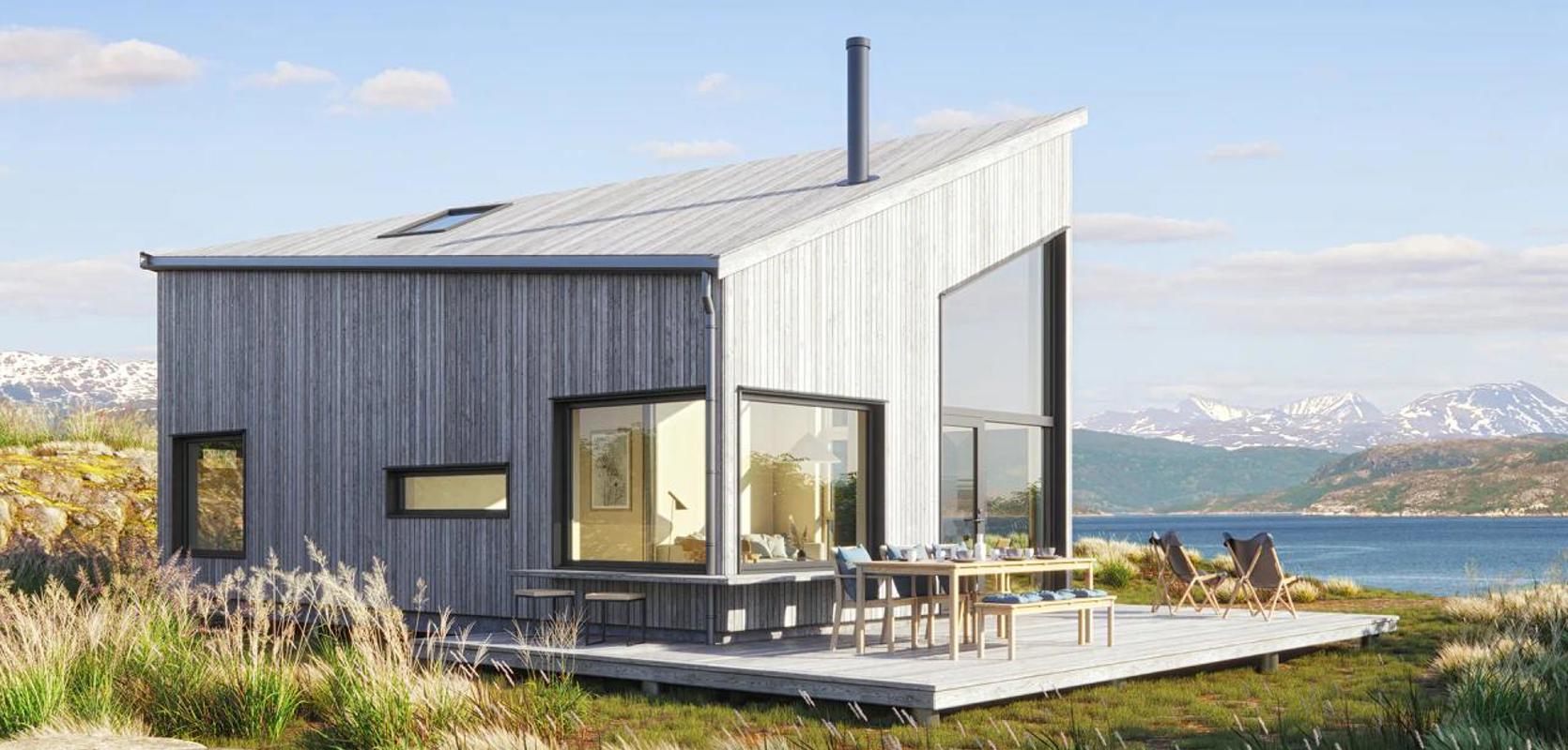 Inngangen til hytta ligger på en av langsidene. Når du trer inn i inngangspartiet, møter du store vindusflater og god takhøyde som gir deg en fantastisk utsikt over det omkringliggende landskapet. En plassbygd sittebenk kan enkelt tilpasses i forlengelse av kjøkkenet og kan brukes som ekstra lagringsplass og/eller soveplass. Utenfor de store hjørnevinduene er det også en plassbygd bord/benk integrert i fasaden.